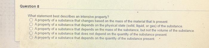 Question 8 What statement best describes an intensive property. It is the same for every sample of every substance. Generally all the properties of matters can be divided into two classes these are intensive and extensive properties.
